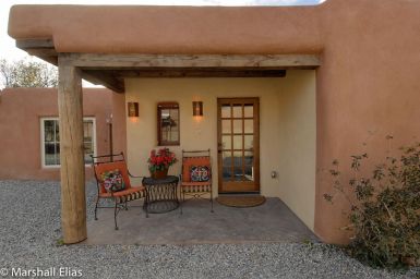 Unit D : The fourth home in this compound begins the “new build” phase of Alma del Cañon. This 1,590 sq ft pitched roof Northern New Mexico style home has a carport and beautiful entryway courtyard which gives access to the home’s common area. The back portal area is perfect for a gathering of friends.
