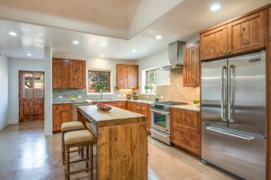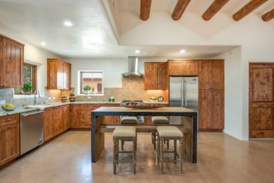 Each of the Alma del Cañon homes honors the human scale of Canyon Road and in keeping with the vernacular of Santa Fe, each is unique. Making discriminating use of the details that contribute to the architectural diversity evident in any walk along Canyon Road, a Northern New Mexico pitched roof neighbors a pueblo style with a shed roof portal within Alma del Cañon. All have private outdoor living spaces and all offer off street parking for residents and their guests. All have two bedrooms, two baths, Kiva fireplaces, stained concrete floors, diamond plaster throughout, and wood and stone countertops.