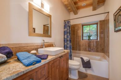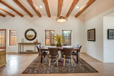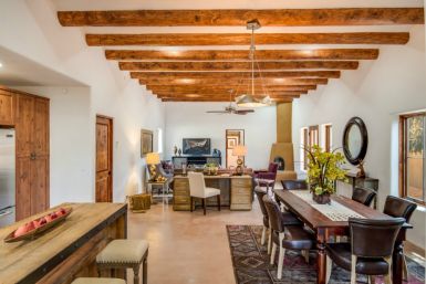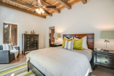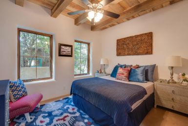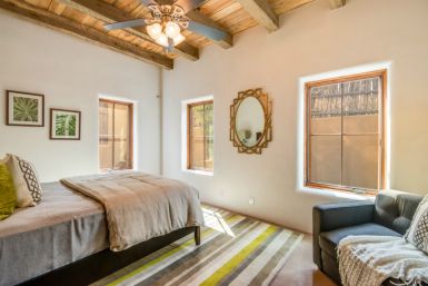 Unit A: This is the largest of the homes in the community with 1,914 sq ft. It also has the most outdoor living space with a large front yard. The direct Canyon Rd. entry and mature apricot tree make this the signpost of Alma del Cañon. We have taken two small contributing historic dwellings and connected them with a spacious, comfortable living room to create a two bedroom two bath home. The covered plaster ceilings and historic accents maintain the homes’ past while the open layout and modern amenities make it the perfect place to embrace the future.